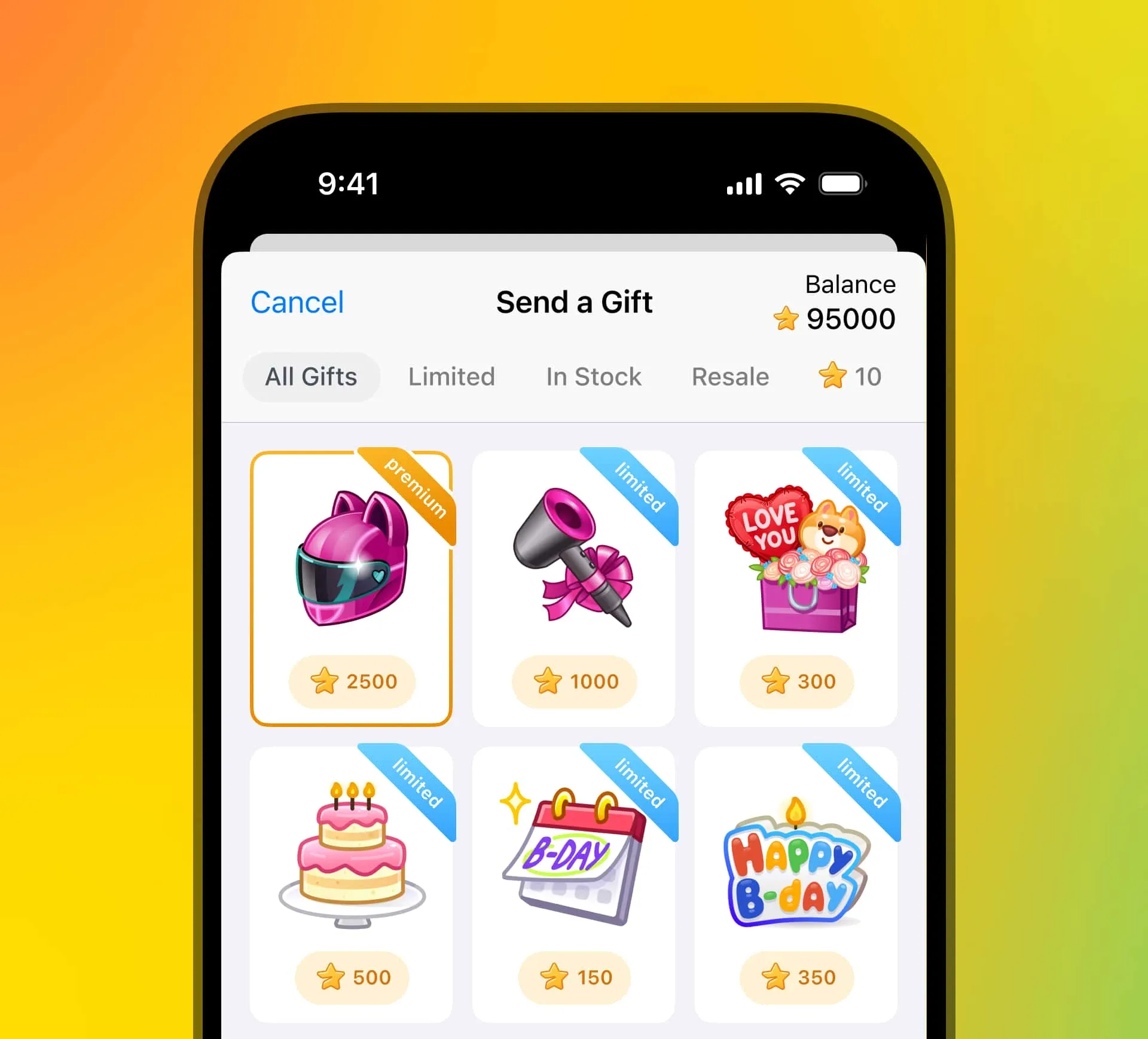 Telegram 礼物非常受欢迎,新品发布往往几分钟内就会售罄。虽然您始终可以在礼物市场从其他用户那里购买礼物,但我们希望更多用户能够在新品发布时第一时间获得礼物。